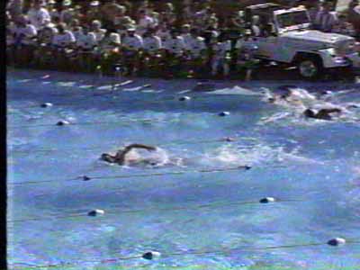 Gruber easily defeats the rest of the field in the 50 yard swimming race